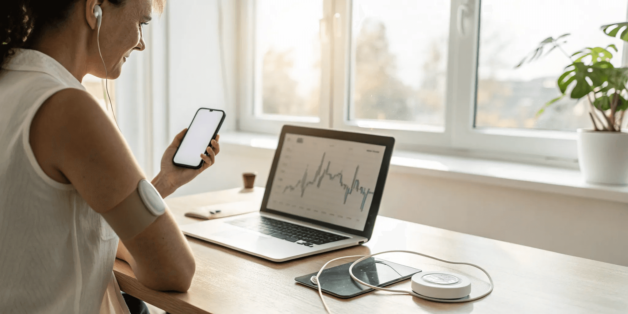 A continuous glucose monitor, or CGM, is a small, wearable sensor that tracks your glucose levels all day and night. Unlike traditional finger-prick tests that give you a single snapshot, a CGM provides a constant stream of information. It shows you the full picture: where your glucose levels are, where they’re heading, and how fast they’re changing.
