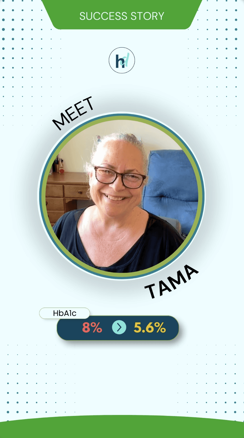 When Tama joined, her health markers reflected a clear metabolic imbalance—HbA1c at 8.6%, fasting blood sugar around 135 mg/dL, and post-meal readings reaching 150–160 mg/dL. She reduced her A1C from 8.6% to 5.6%, lost 50 lbs, and rebuilt daily movement through sustainable changes and steady, guided care.